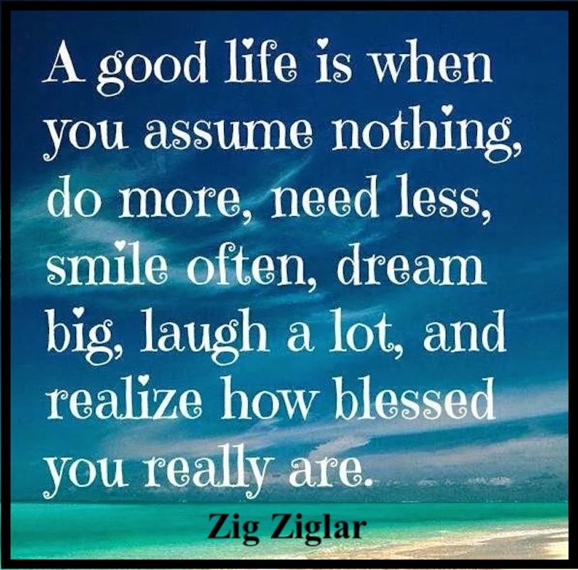 “A good life is when you assume nothing, do more, need less, smile often, dream big, laugh a lot, and realize how blessed you really are.” — Zig Ziglar