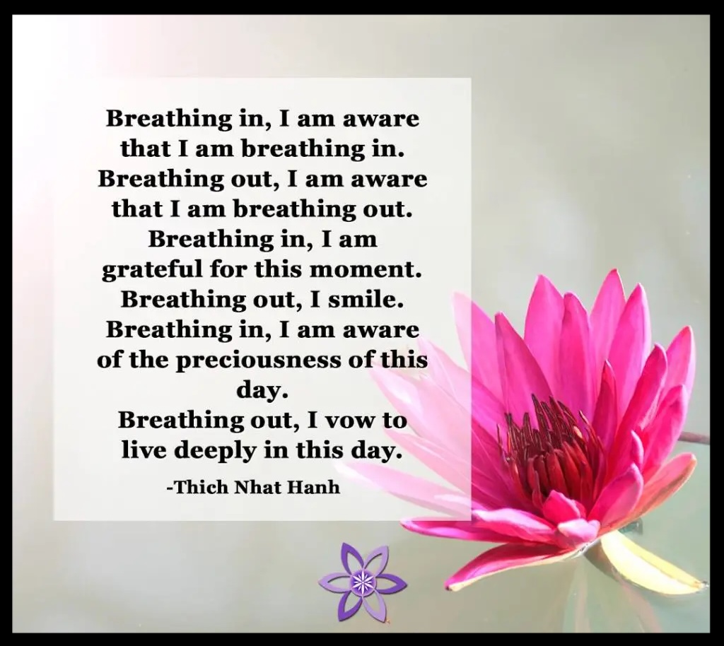 “Breathing in, I am aware that I am breathing in. Breathing out, I am aware that I am breathing out. Breathing in, I am grateful for this moment. Breathing out, I smile. Breathing in, I am aware of the preciousness of this day. Breathing out, I vow to live deeply in this day.” — Thich Bhat Hanh