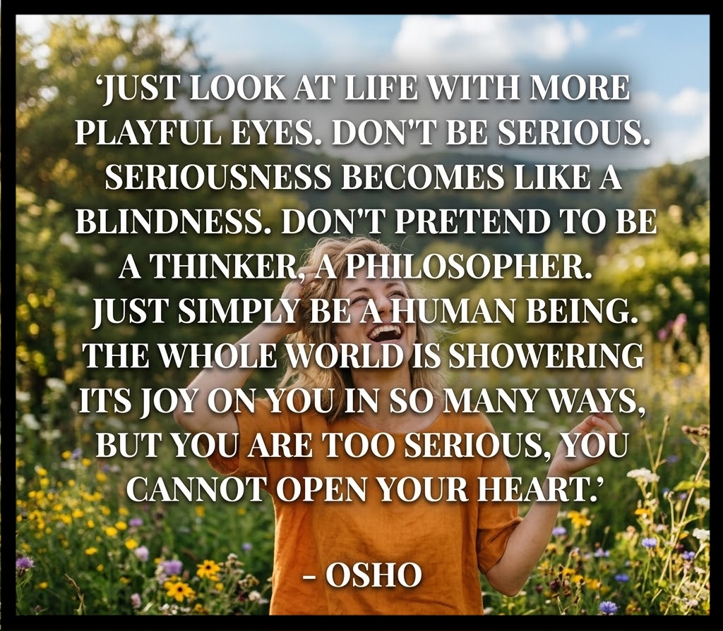 “Just look at life with more playful eyes. Don’t be serious. Seriousness becomes like a blindness. Don’t pretend to be a thinker, a philosopher. Just simply be a human being. The whole world is showering its joy on you in so many ways, but you are too serious, you cannot open your heart!” — Osho